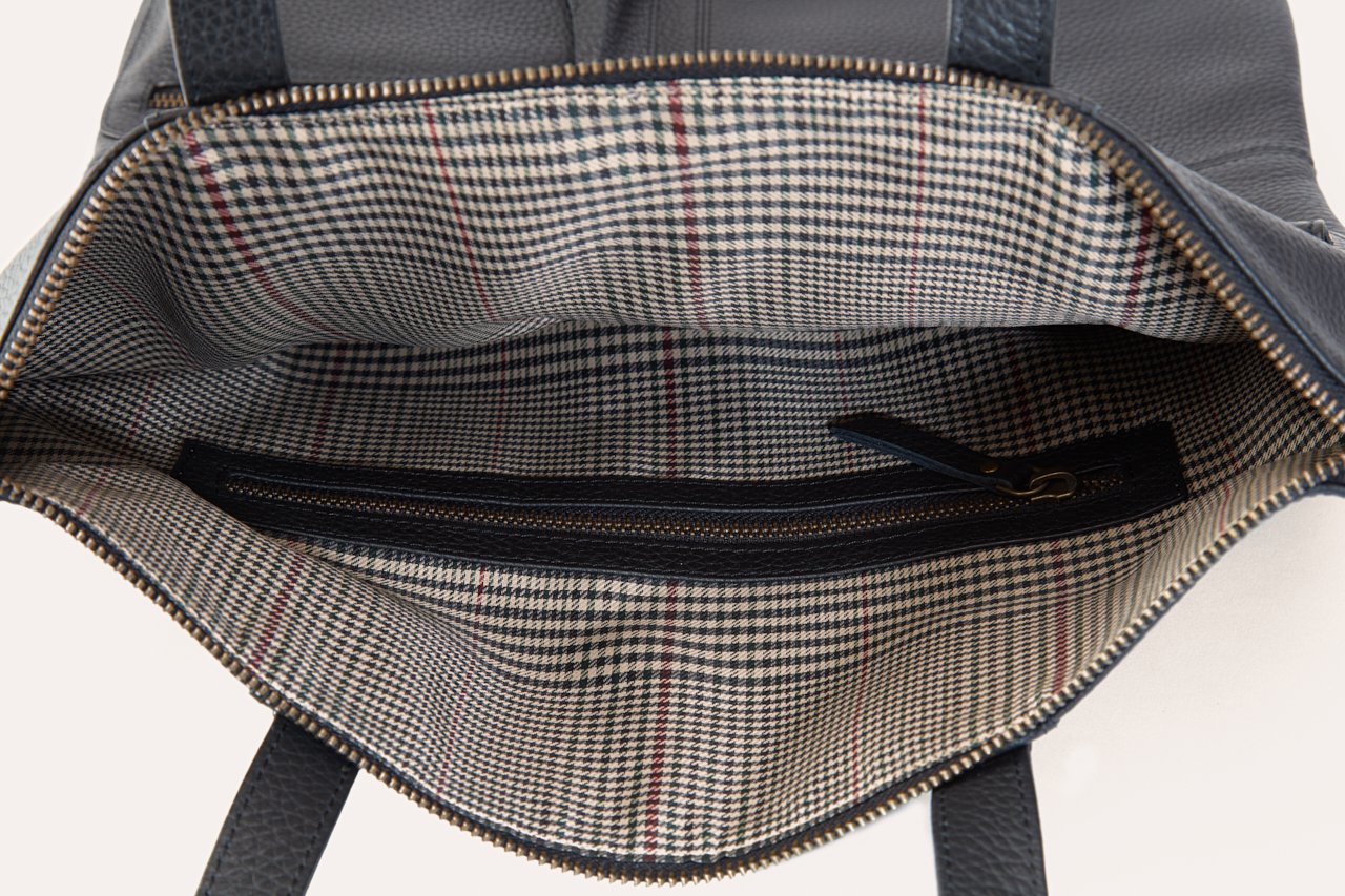 The Fold n Hold Tote?features a long bag shape with a softly rounded bottom and two quirky outside pockets. The rich leather is soft and supple with a sophisticated plaid lining. Hang the tote off of your shoulder or fold it over for casual carrying and let the delicate zipper tassels fly out for added charm.